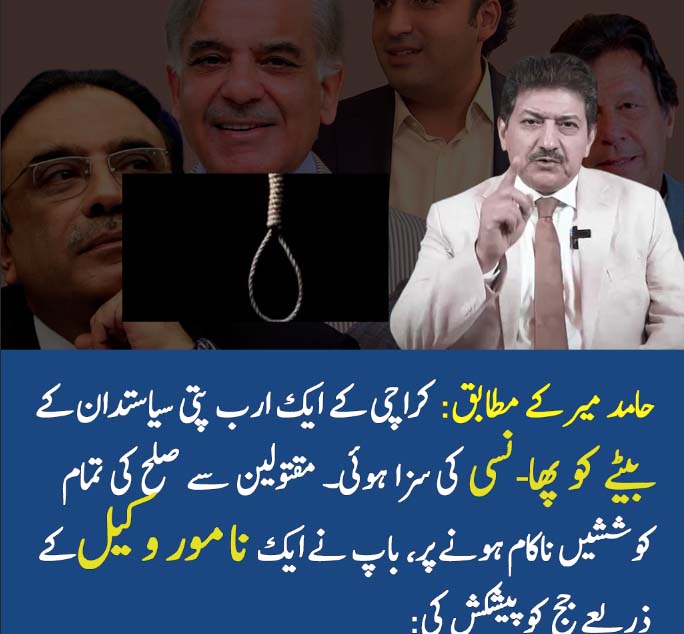 حامد میر کے حوالے سے ایک مشہور واقعہ بیان کیا جاتا ہے کہ کراچی کے ایک ارب پتی سیاستدان کے بیٹے کو پھانسی کی سزا سنا دی گئی۔ سزا سنانے کے بعد ملزم کے باپ نے مقتولین سے صلح کرنے کی بڑی کوشش کی مگر ناکام رہا۔ آخرکار اس نے ایک بڑے نامور وکیل کے ذریعے کیس کے جج سے رابطہ کیا اور پیشکش کی: “اگر تم میرے بیٹے کو کسی طرح بھی پھانسی سے بچا لو تو میں تمہاری زندگی بدل دوں گا اور تمہیں نقد ایک ارب روپے دوں گا۔”