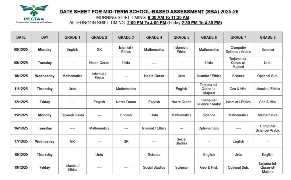 تفصیلات کے مطابق پنجاب ایجوکیشن انیشی ایٹیوز مینجمنٹ اتھارٹی نے وسط مدتی اسکول بیسڈ اسیسمنٹ 2025-26 کے لیے ڈیٹس شیٹ جاری کر دی ہے۔